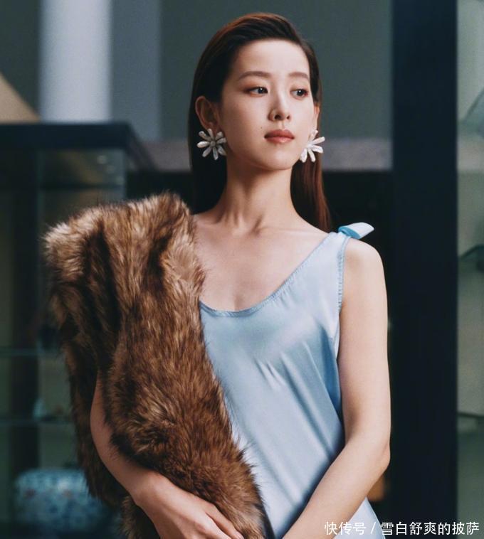 在拍摄杂志时,她也更换了几套服装,这件穿着浅蓝色丝绸吊带裙的裙子,材质细腻,垂坠,展现了简约而高级的质感。棕褐色的毛皮披肩被随意地搭在肩膀上,形成了柔美与野性材质的完美结合,这不仅增添了一种奢华感,同时也平衡了整体造型的轻盈感。她双臂轻抱披肩的姿势自然内敛,侧目凝视的眼神沉静深邃,表现出来的都是褪去少女时期的甜美,展现出成熟女性的从容与故事感。